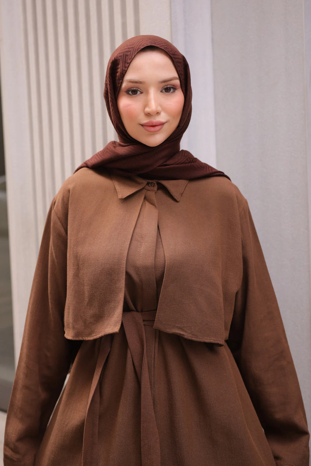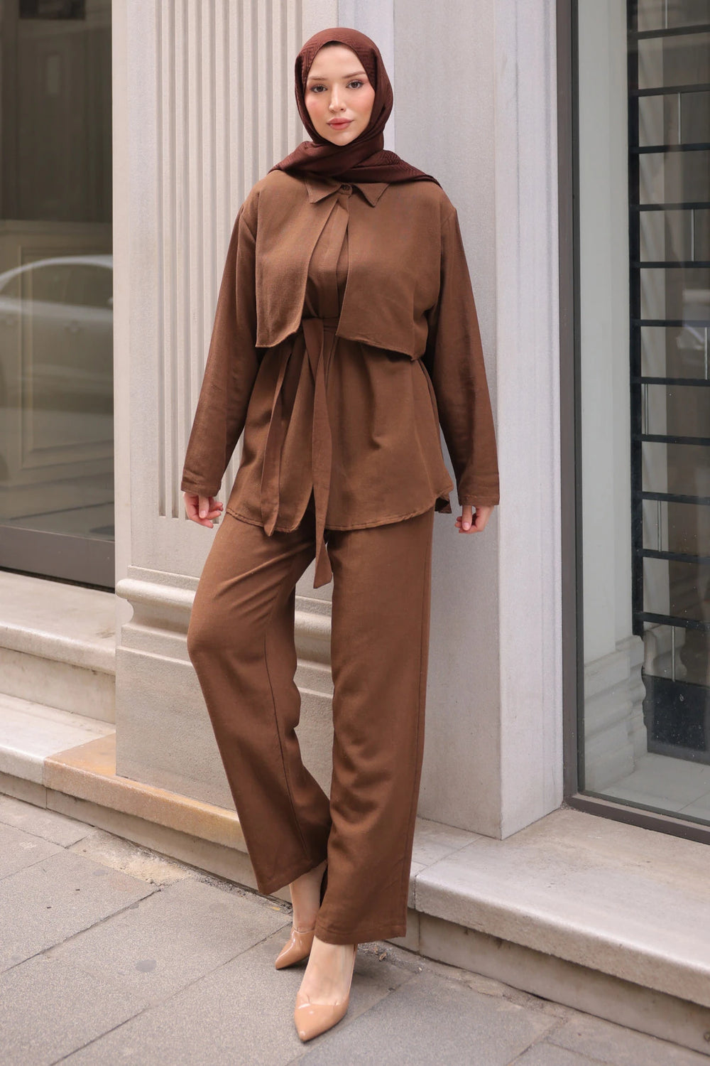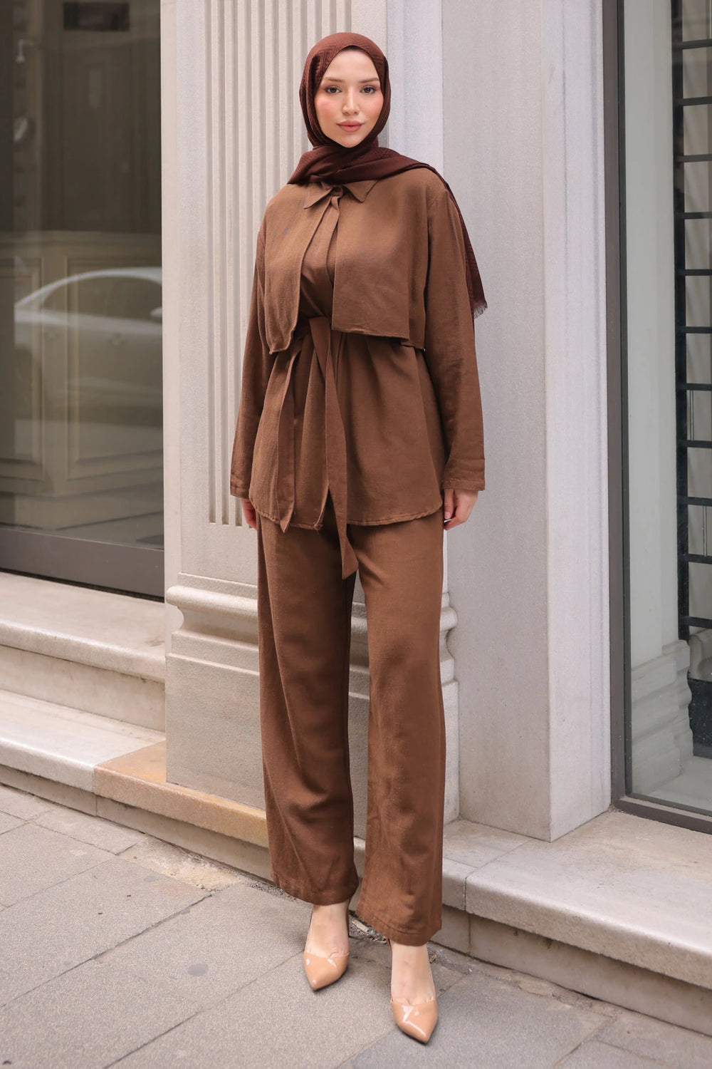 Takımın üst kısmında yer alan gömlek yaka detayı, modern ve klasik tarzı buluşturur. Ön kısmındaki kuşak detayı bel hattını vurgulayarak zarif bir siluet oluşturur. Düz renk tasarımı, farklı aksesuarlarla kolayca kombinlenebilir.
