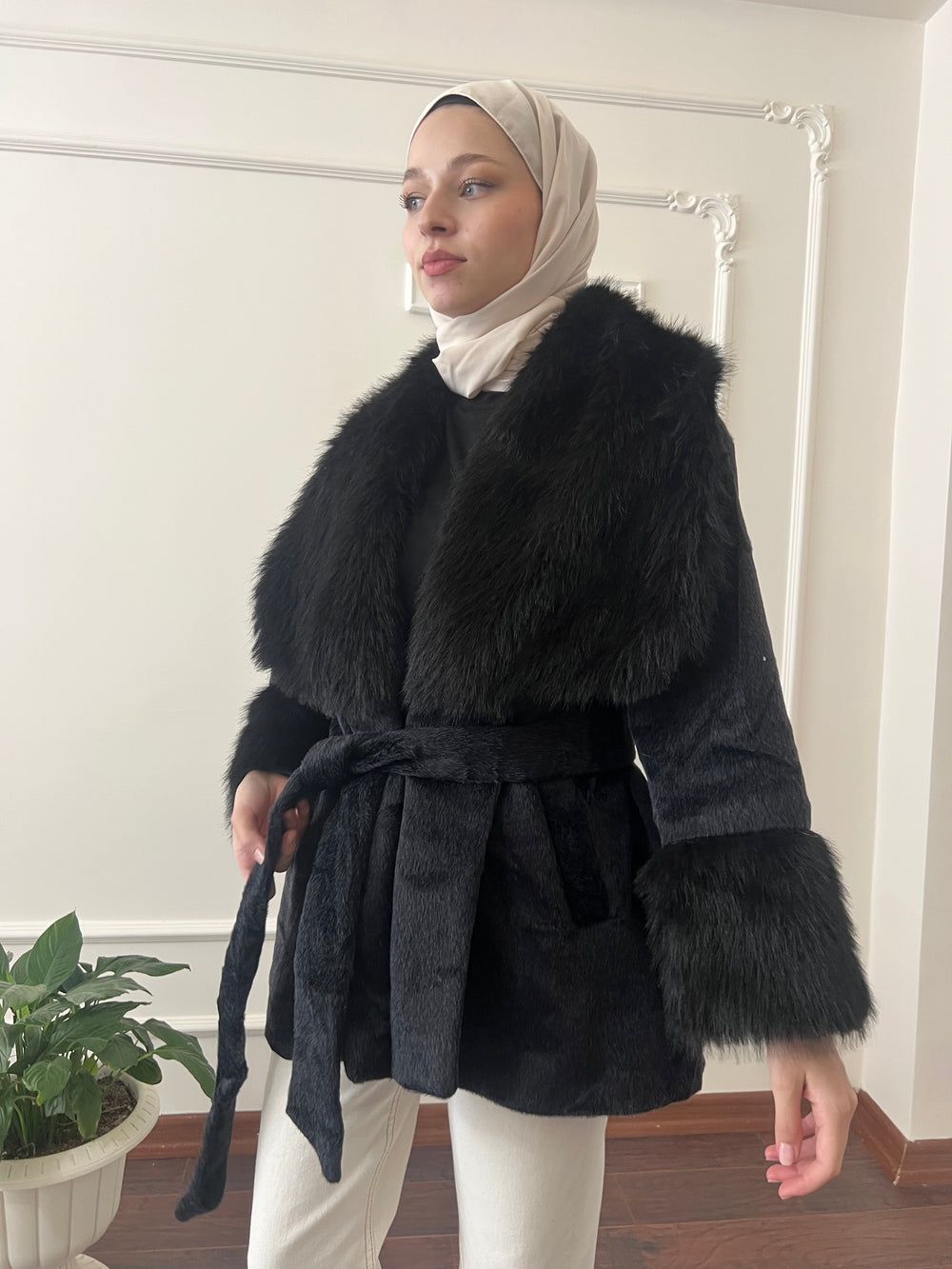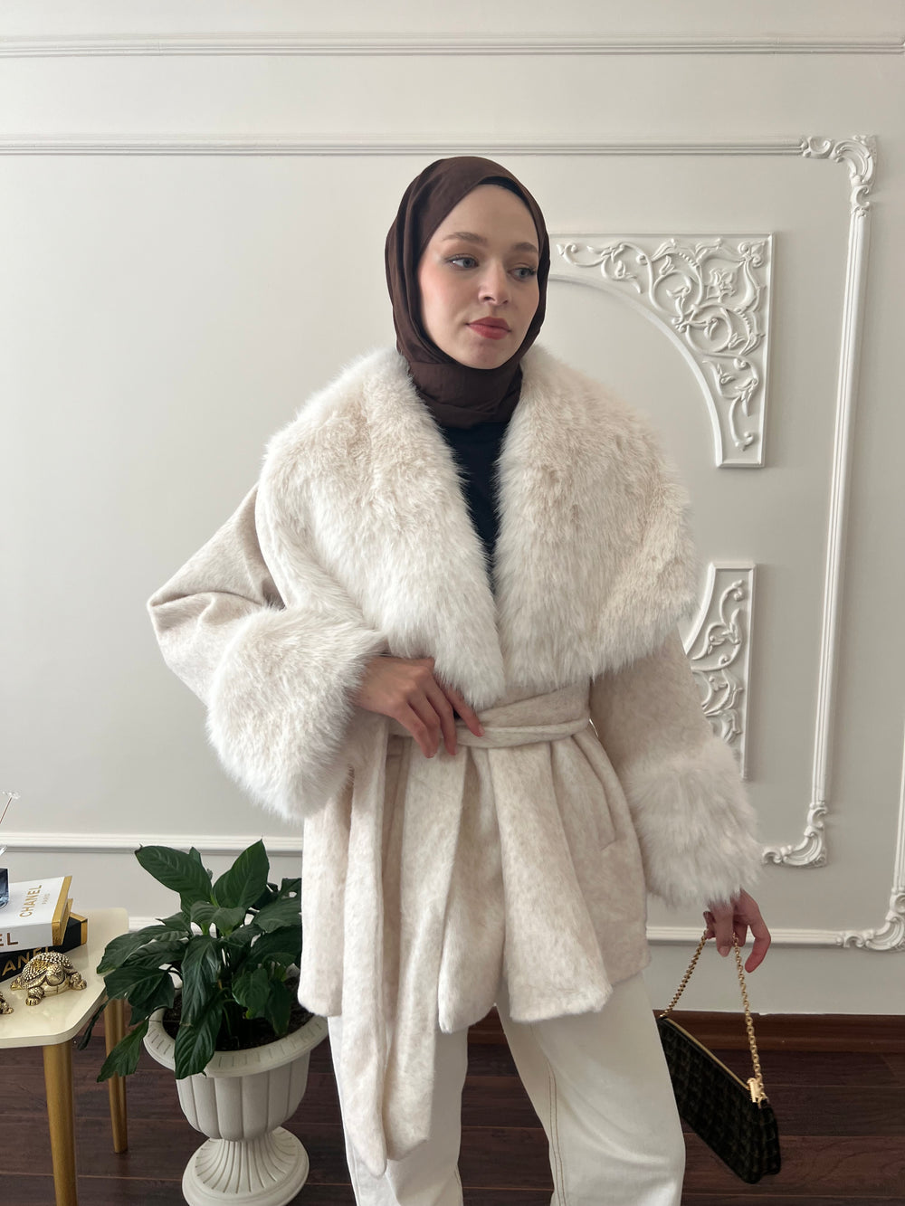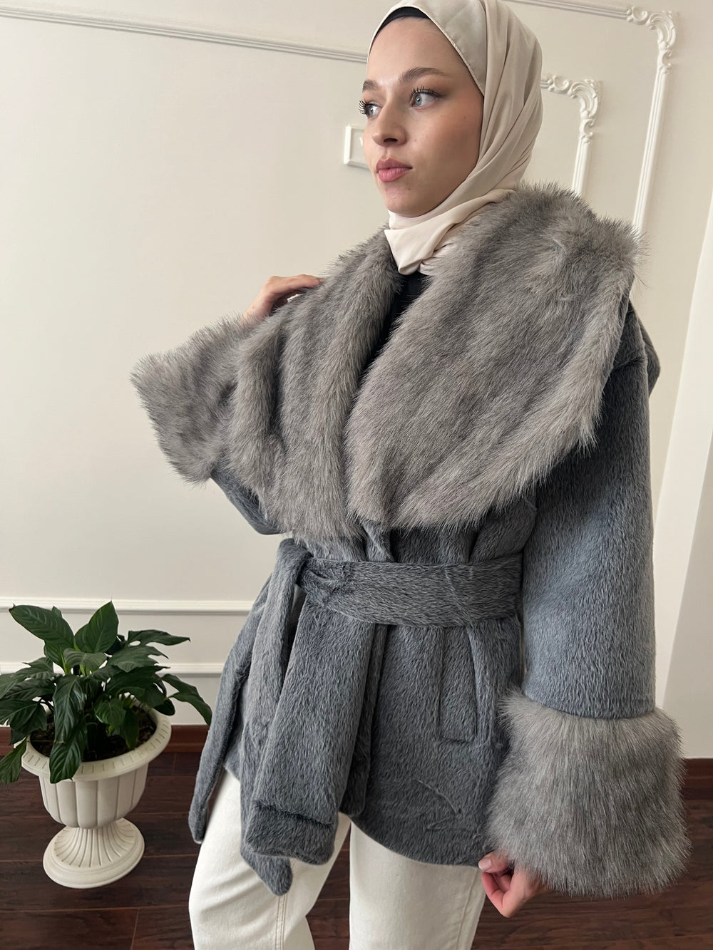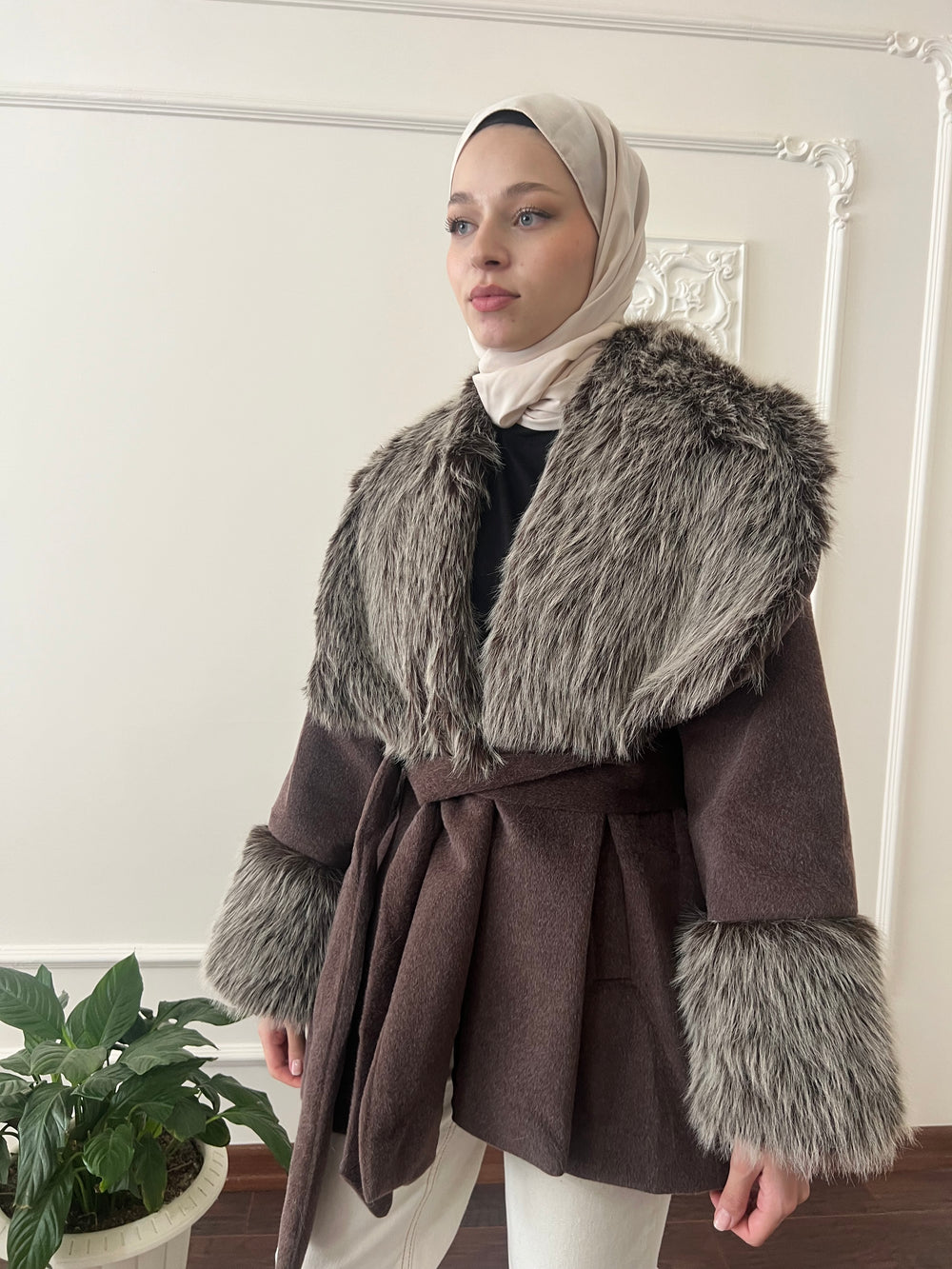 Kol ve yakası kürk detaylı , kullanılabilir çift cepli , içi astarlı , seyyar kuşaklıdır