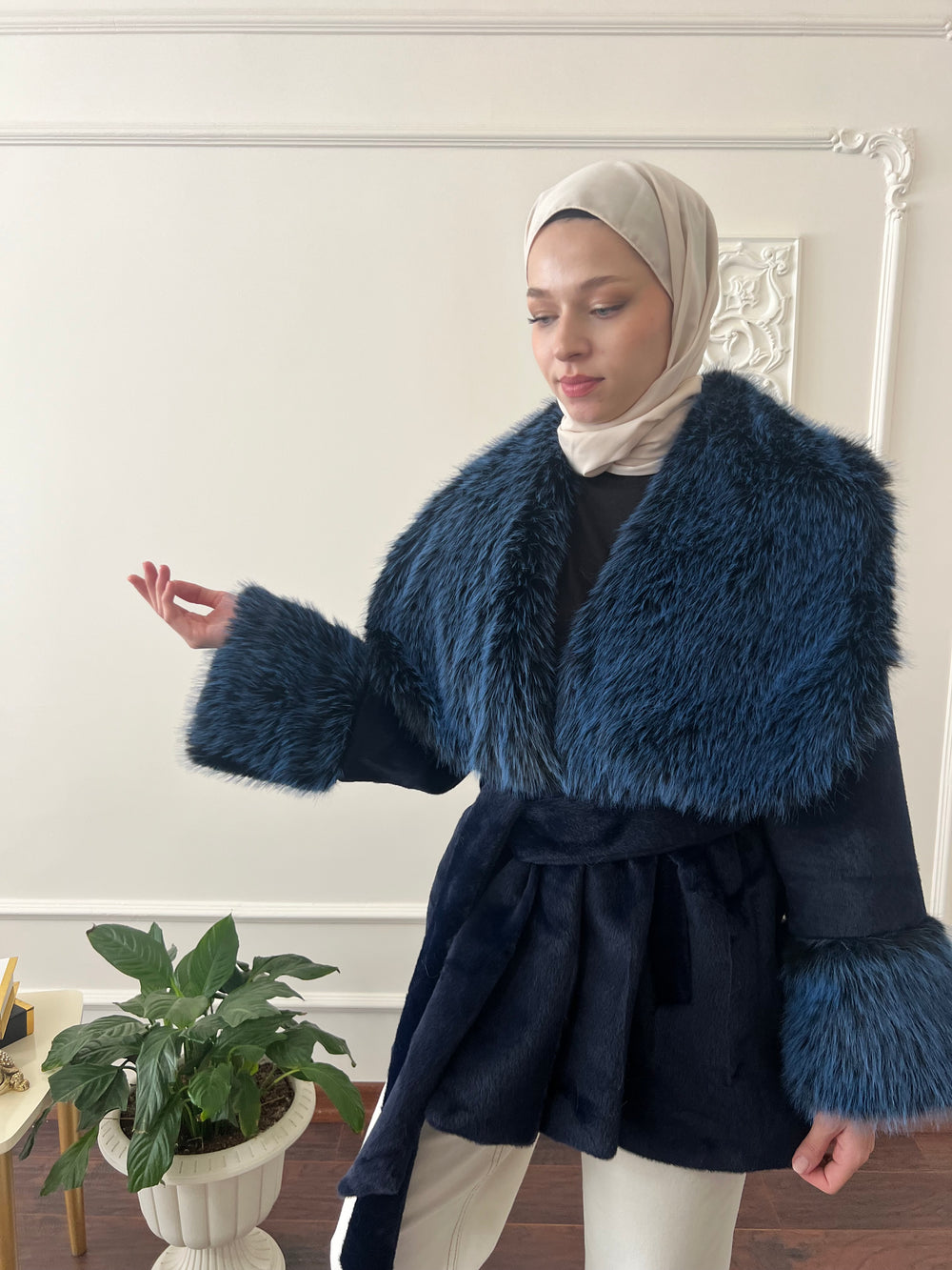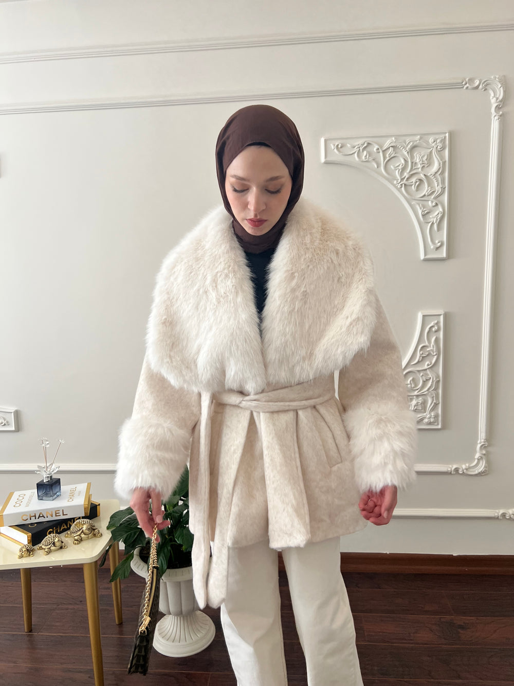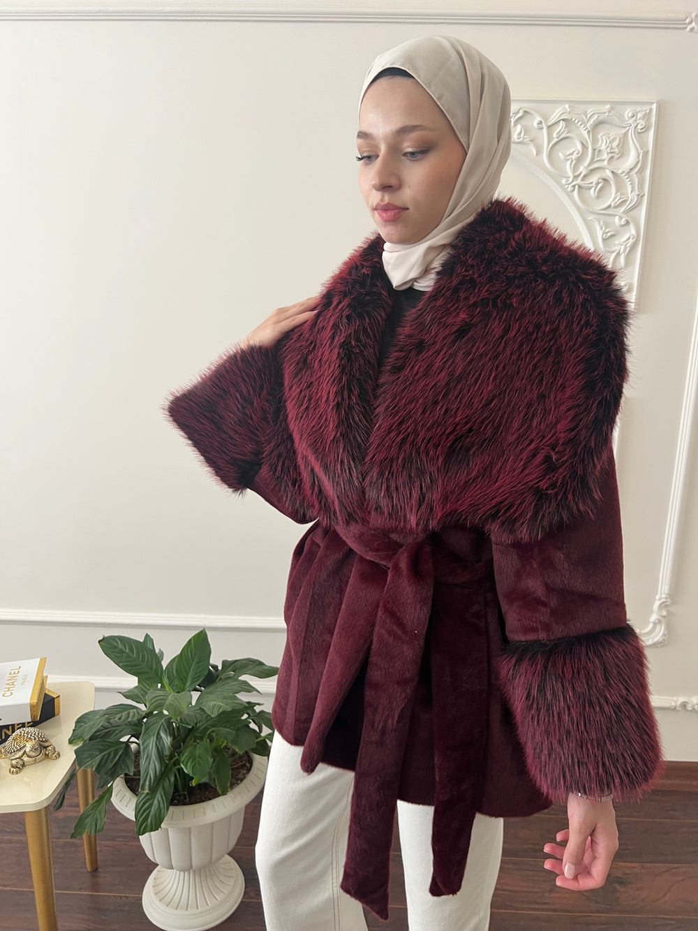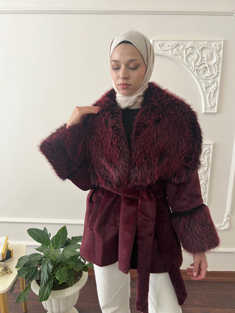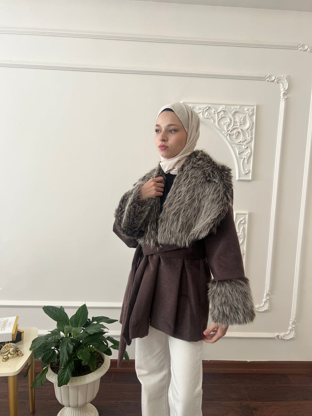Kol ve yakası kürk detaylı , kullanılabilir çift cepli , içi astarlı , seyyar kuşaklıdır