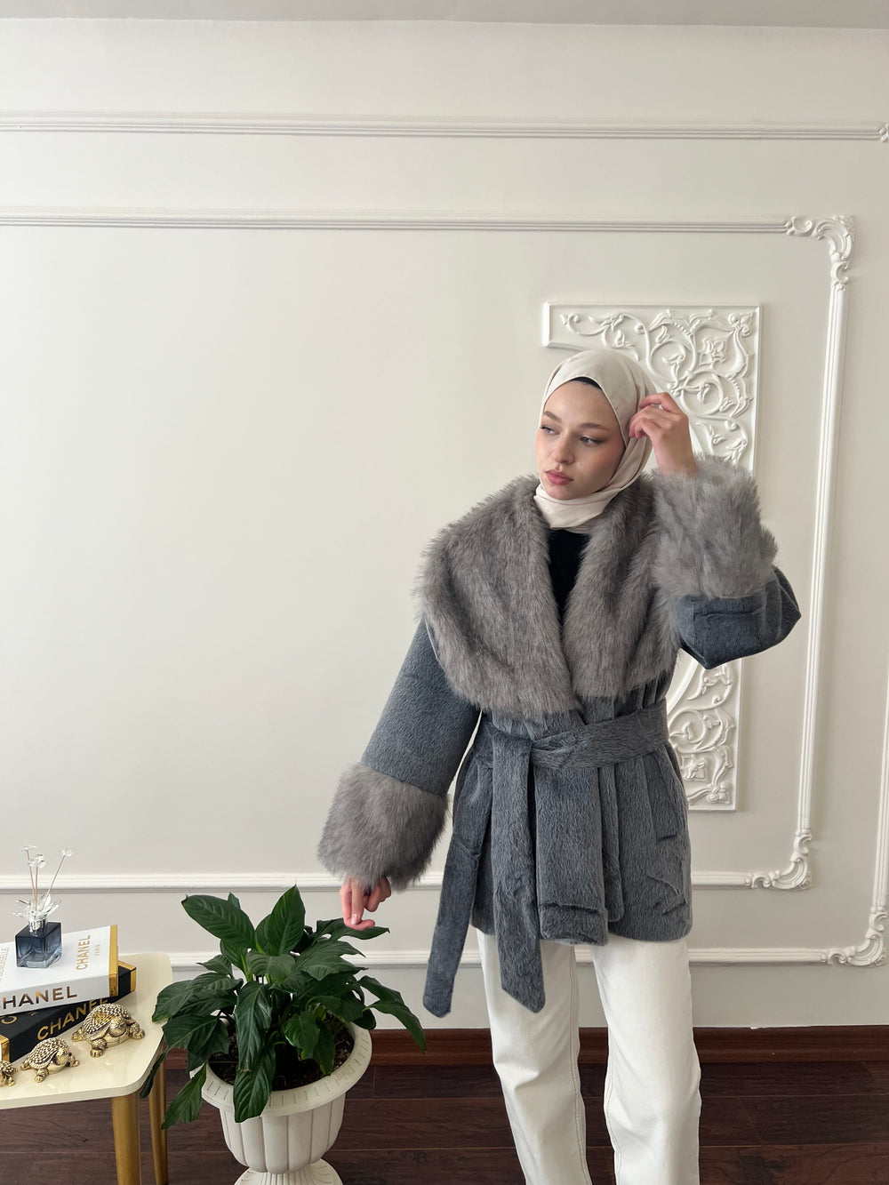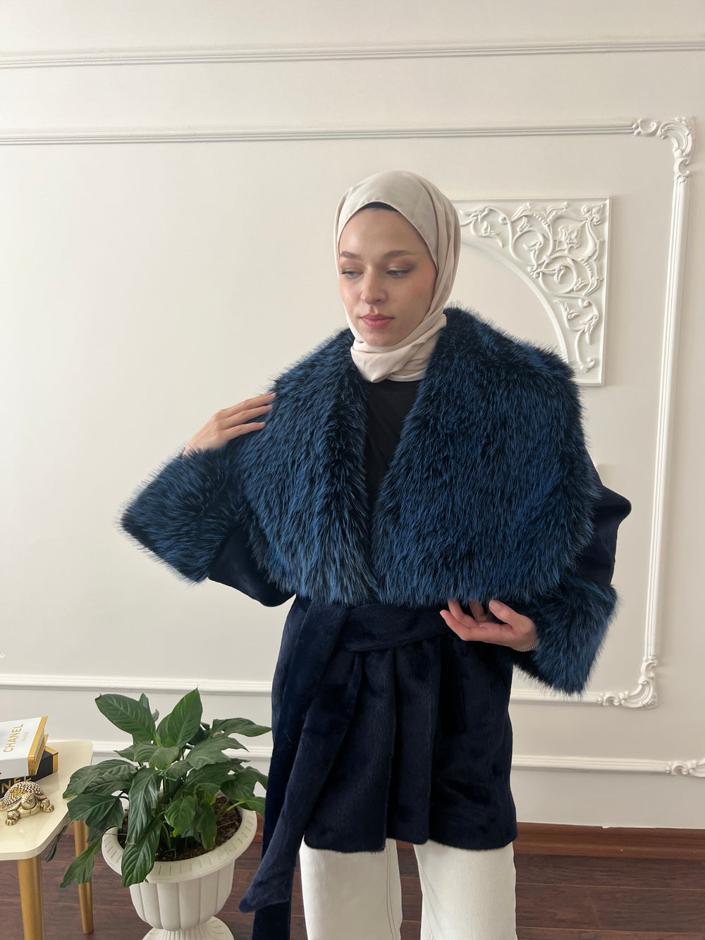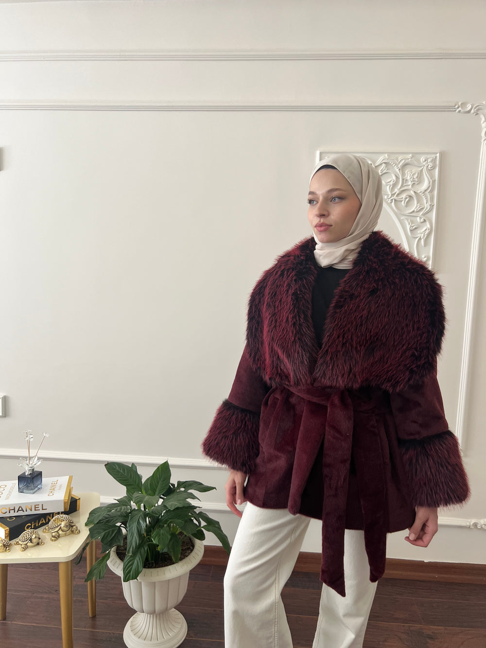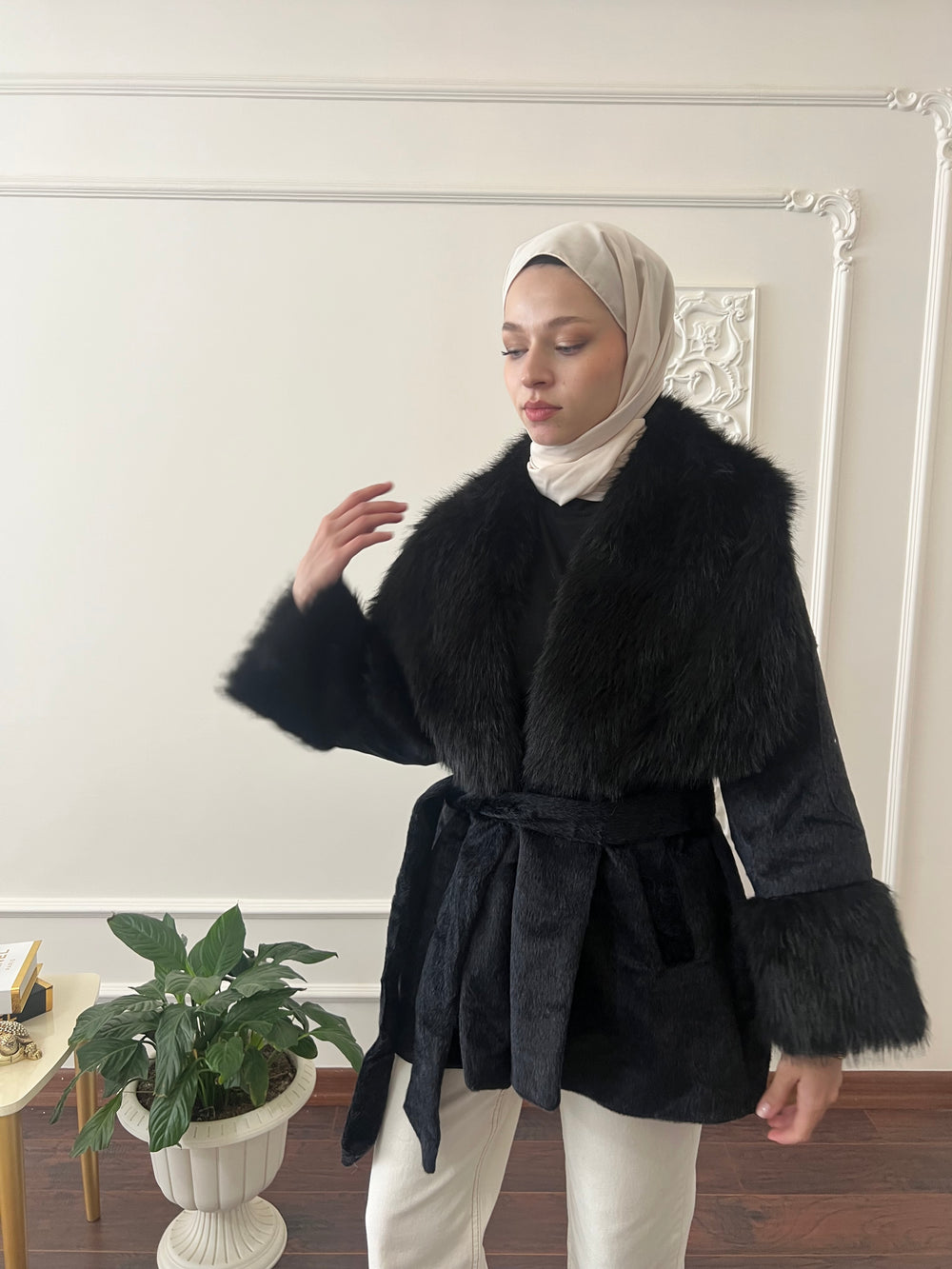 Kol ve yakası kürk detaylı , kullanılabilir çift cepli , içi astarlı , seyyar kuşaklıdır